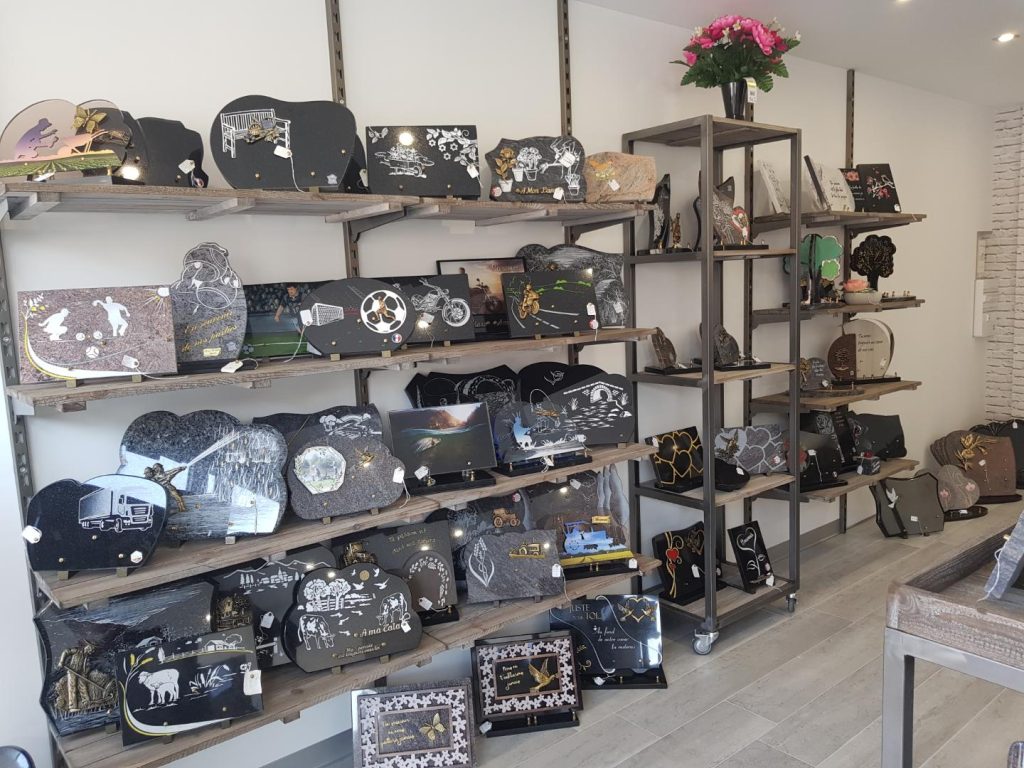 - Les plaques funéraires : en granit, en marbre, en pierre ou tout autre matériau, les plaques peuvent être ornées de gravures, de citations, d’épitaphes, de symboles ou même d’images.